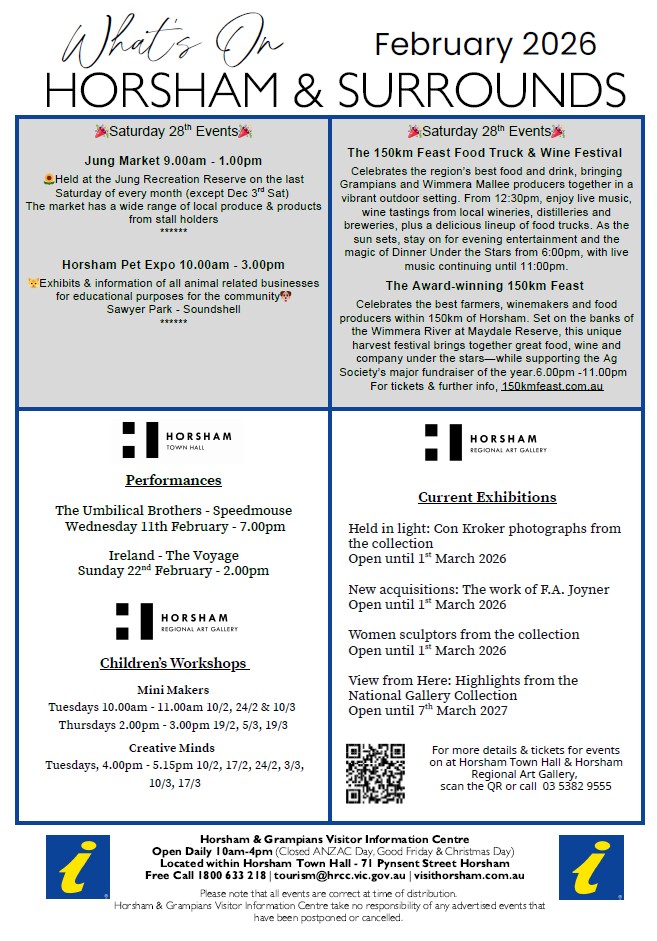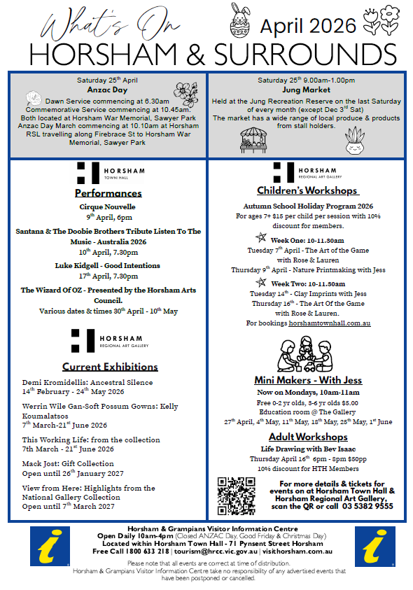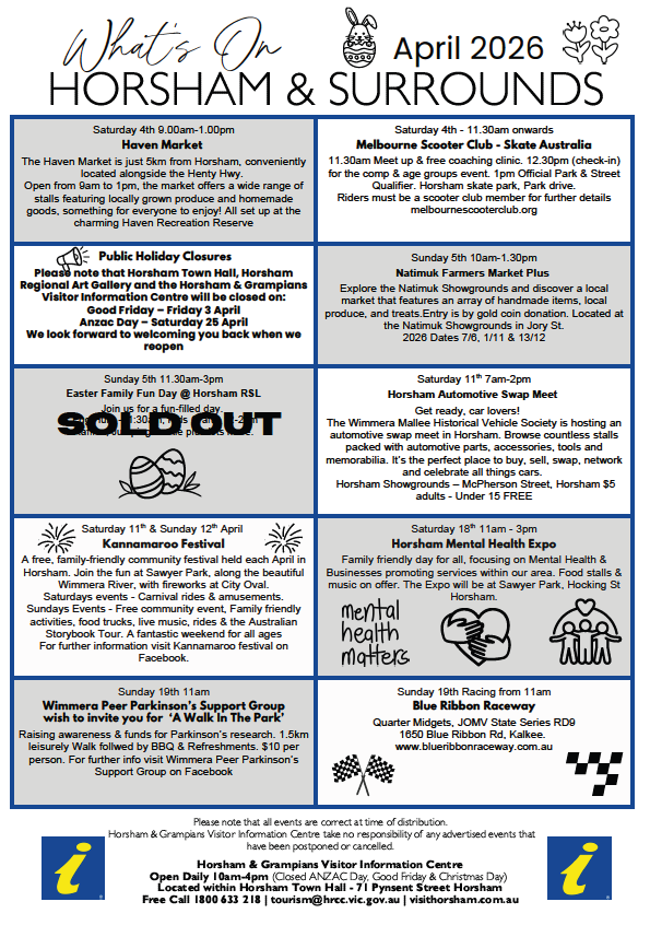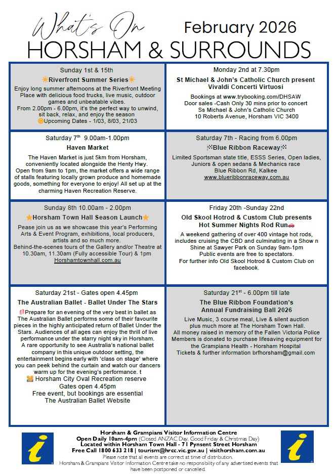 Horsham is a vibrant regional city nestled in the centre of the highly productive Wimmera grain belt. The region is renowned for its dynamic arts community, ensuring there is always something exciting happening. The surrounding area offers a vast array of recreational activities eg hiking, biking, rock climbing, golfing, ten pin bowling, fishing, water skiing, and skating.